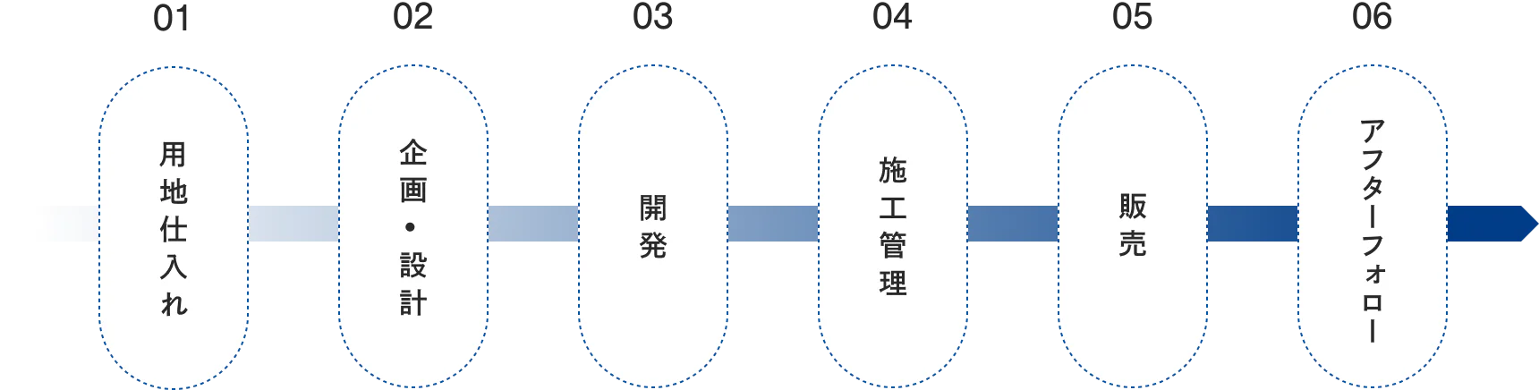 企画から竣⼯、アフターフォローまで⼀貫した体制。確かな価値を創造するディベロップメント。