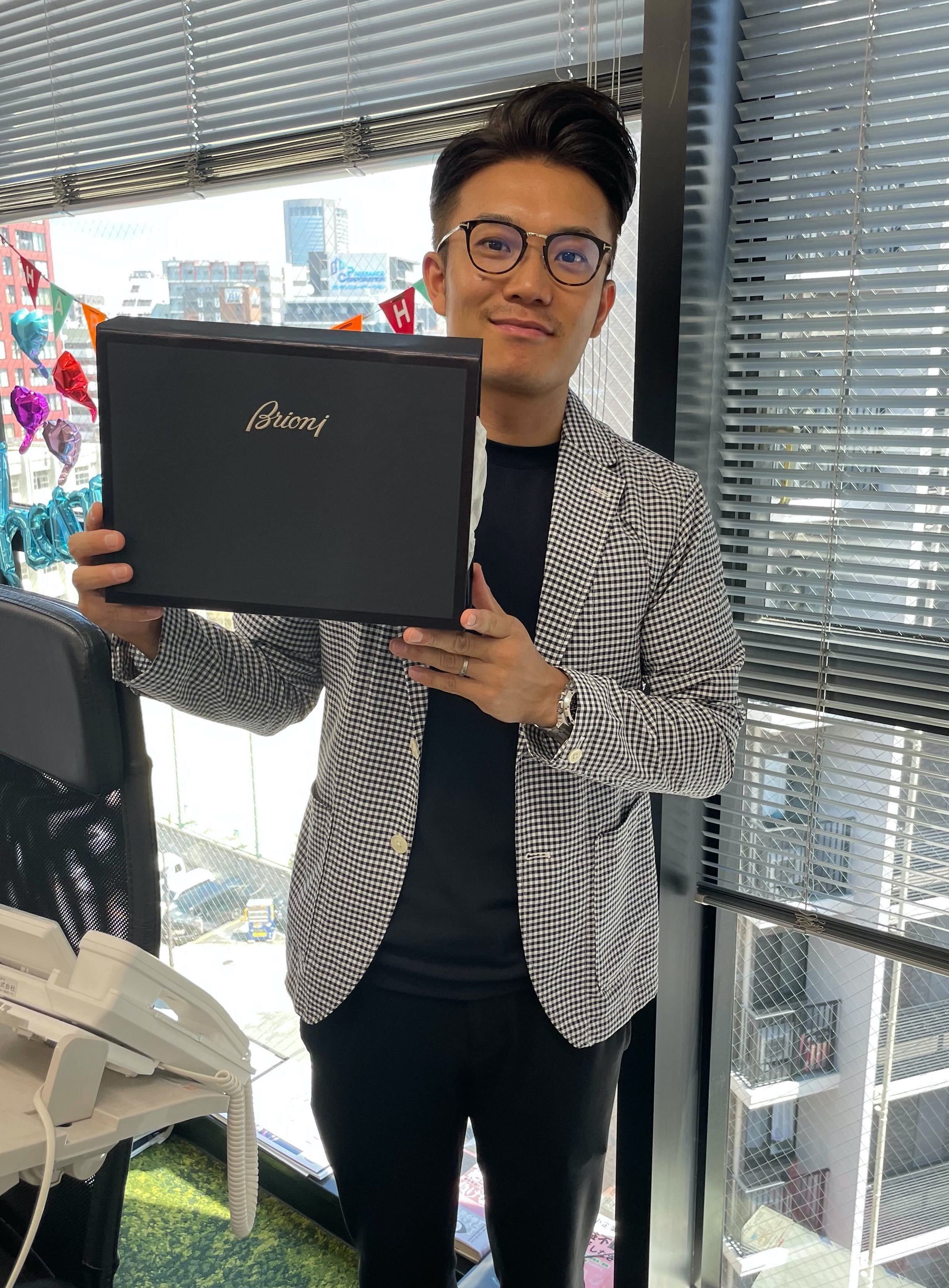 誕生日ということでプレゼントも。営業チームからはイタリアの高級紳士服ブランド「ブリオーニ」のポロシャツが贈られました。