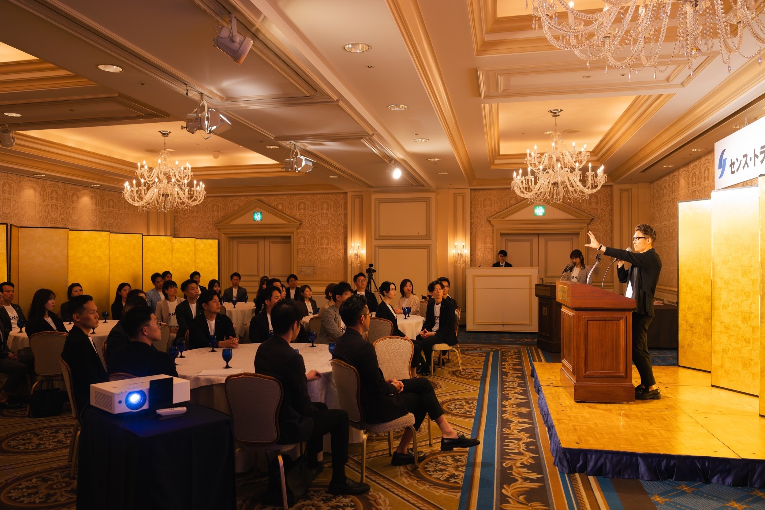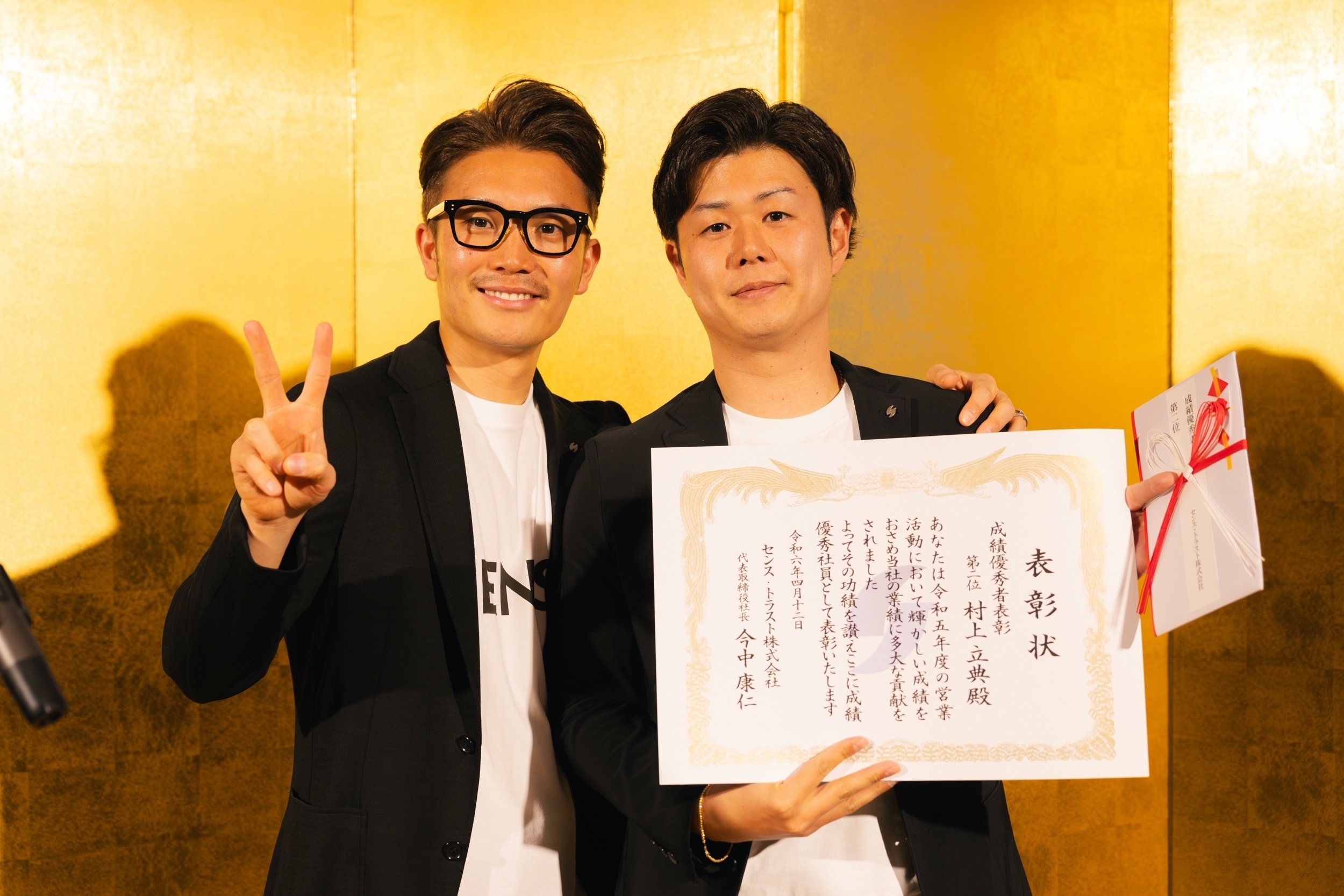 第一部のクライマックスは表彰式です。2023年の1年間、センス・トラストの成長に最も貢献した社員を表彰するもので、「新人王賞」「奨励賞」「唯一無二で賞」「社長賞」「副社長賞」「成績最優秀者賞」と多くのアワードで受賞者を決定し、商品券2万円から賞金10万円までの副賞を用意しました。