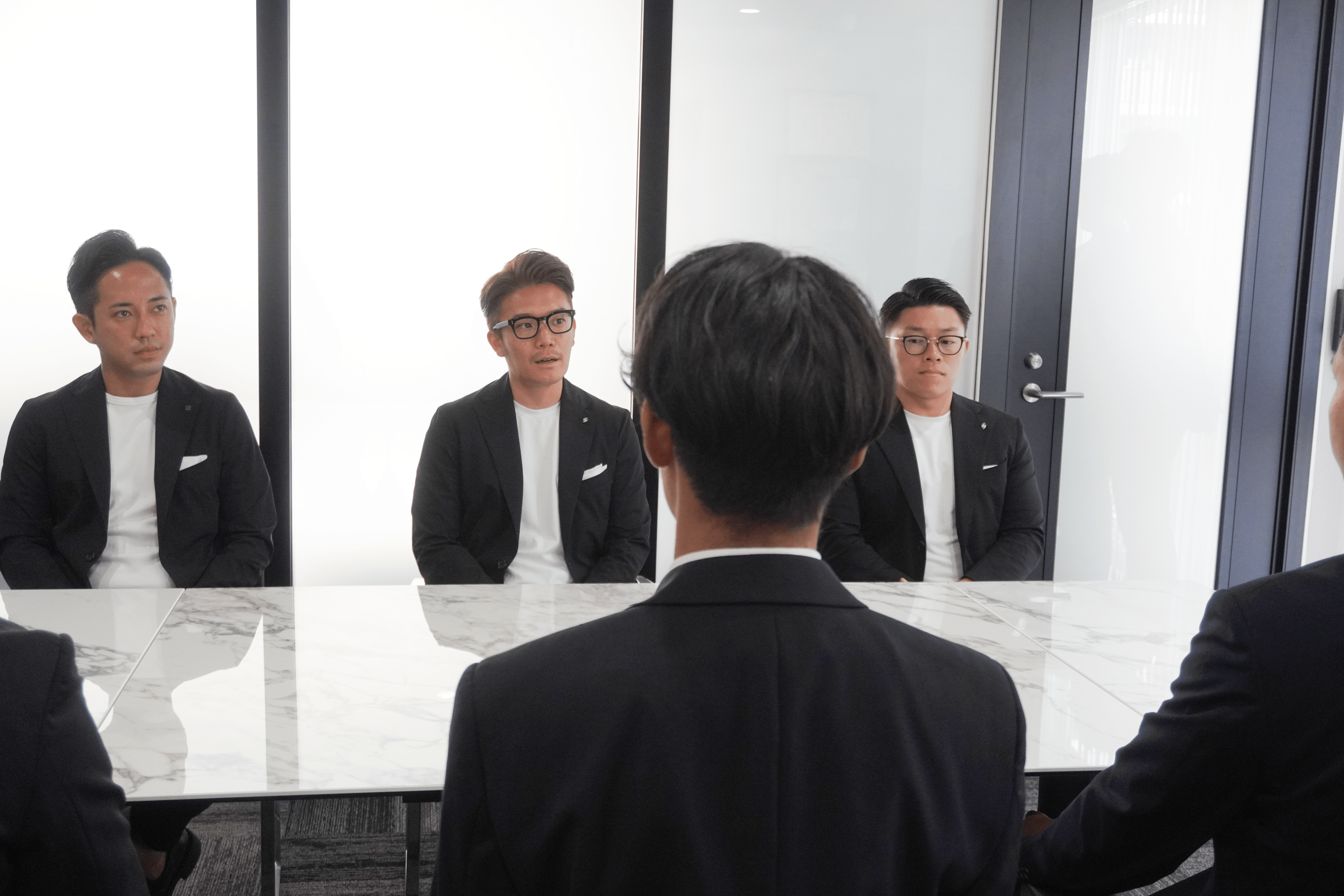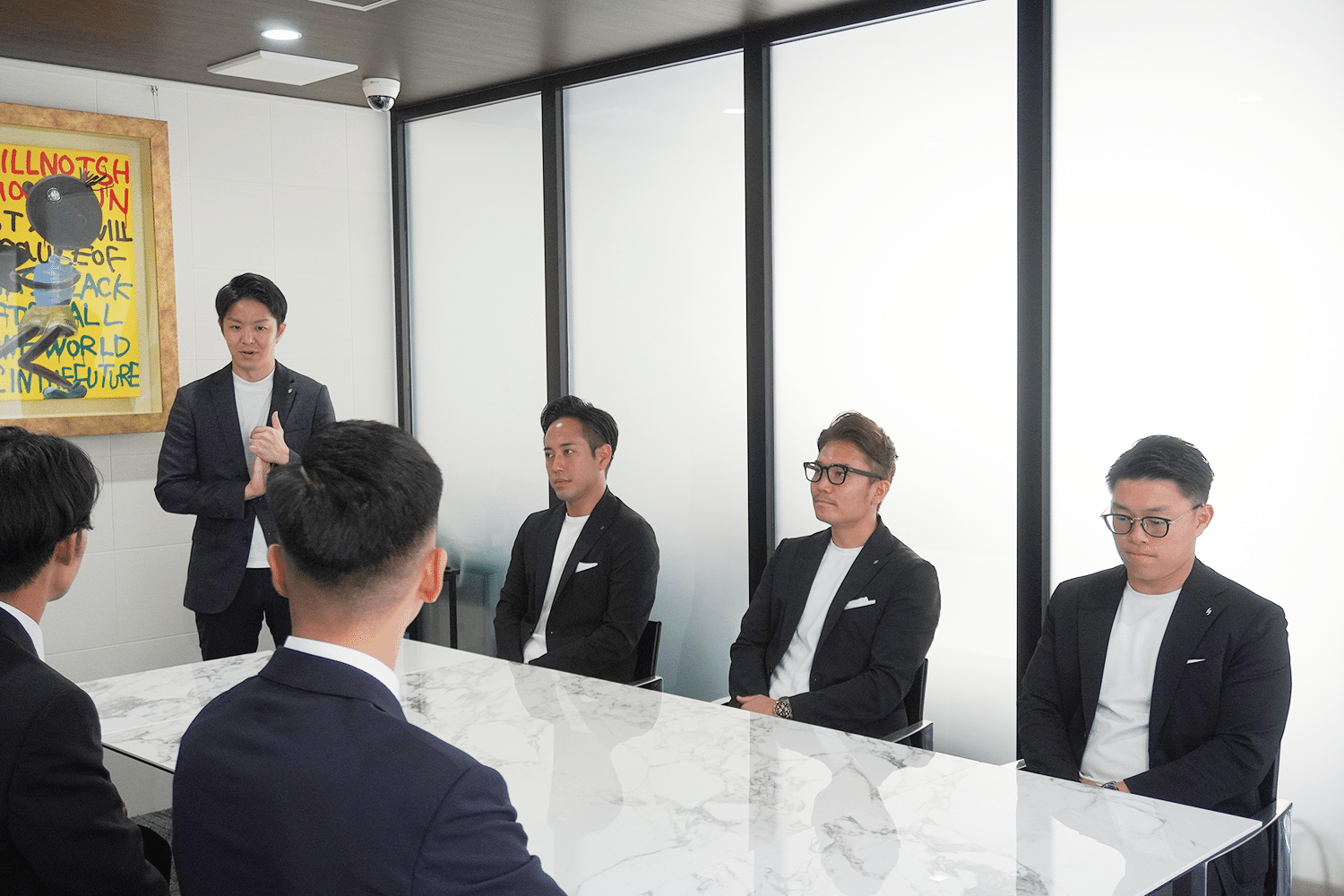 代表今中からはセンス・トラストの創業からの歩みが語られ、「新卒一期生を迎える今日が、新たな未来への大きな一歩となる。社会人になること、大人になることはとても楽しいんだ。未来は明るい」という力強い言葉に、内定者たちも真摯な姿勢で耳を傾けていました。