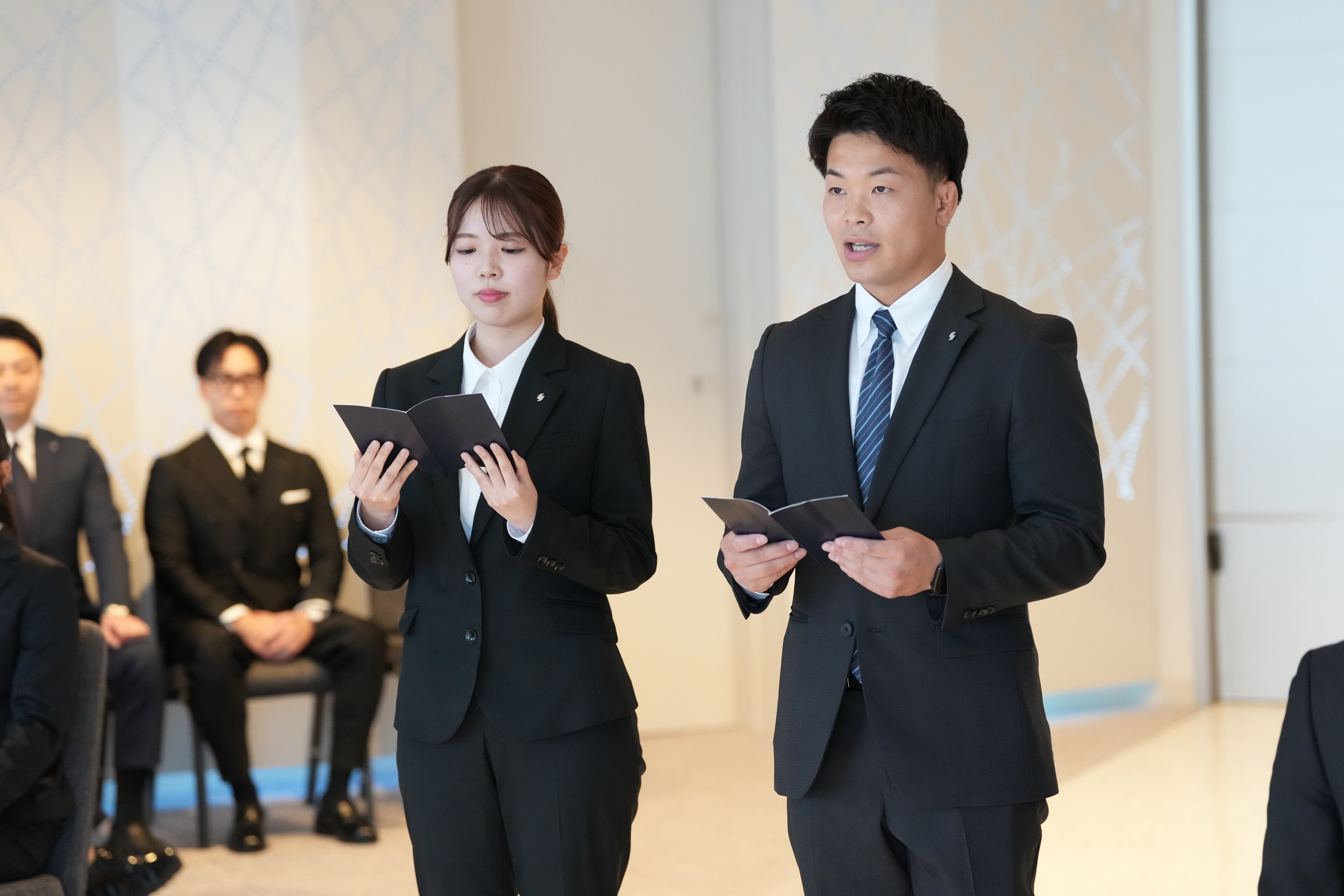 新入社員代表の表明では、営業事務は「仲間が力を発揮できる環境を創ること」、営業職は「『唯一無二の、感動』を届けること」を掲げ、それぞれの立場から“挑戦し続ける”という決意を力強く表明しました。