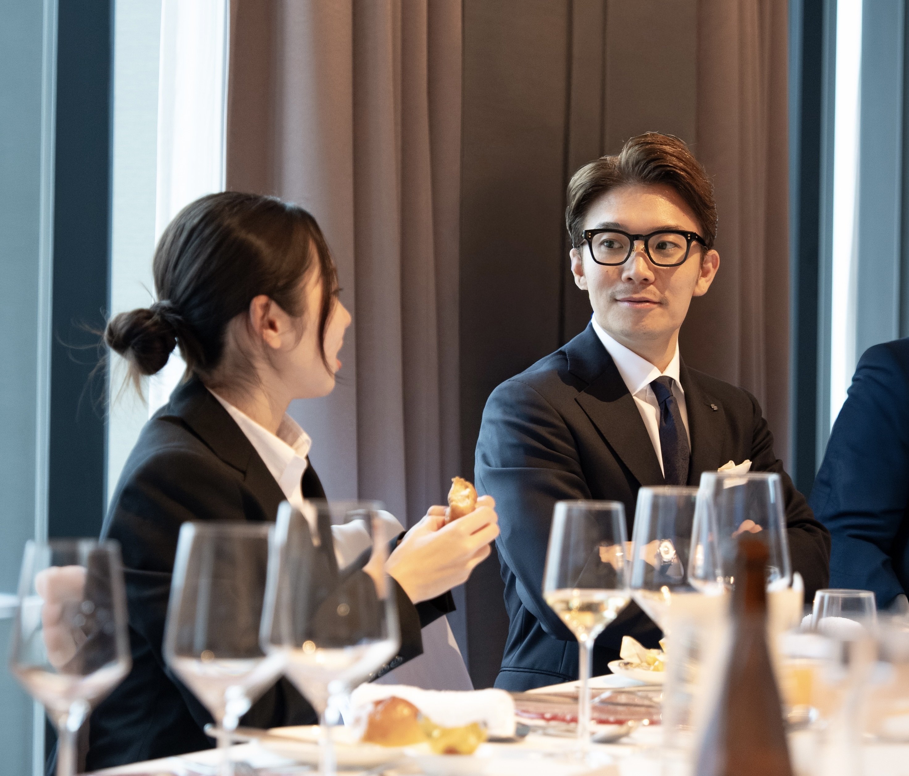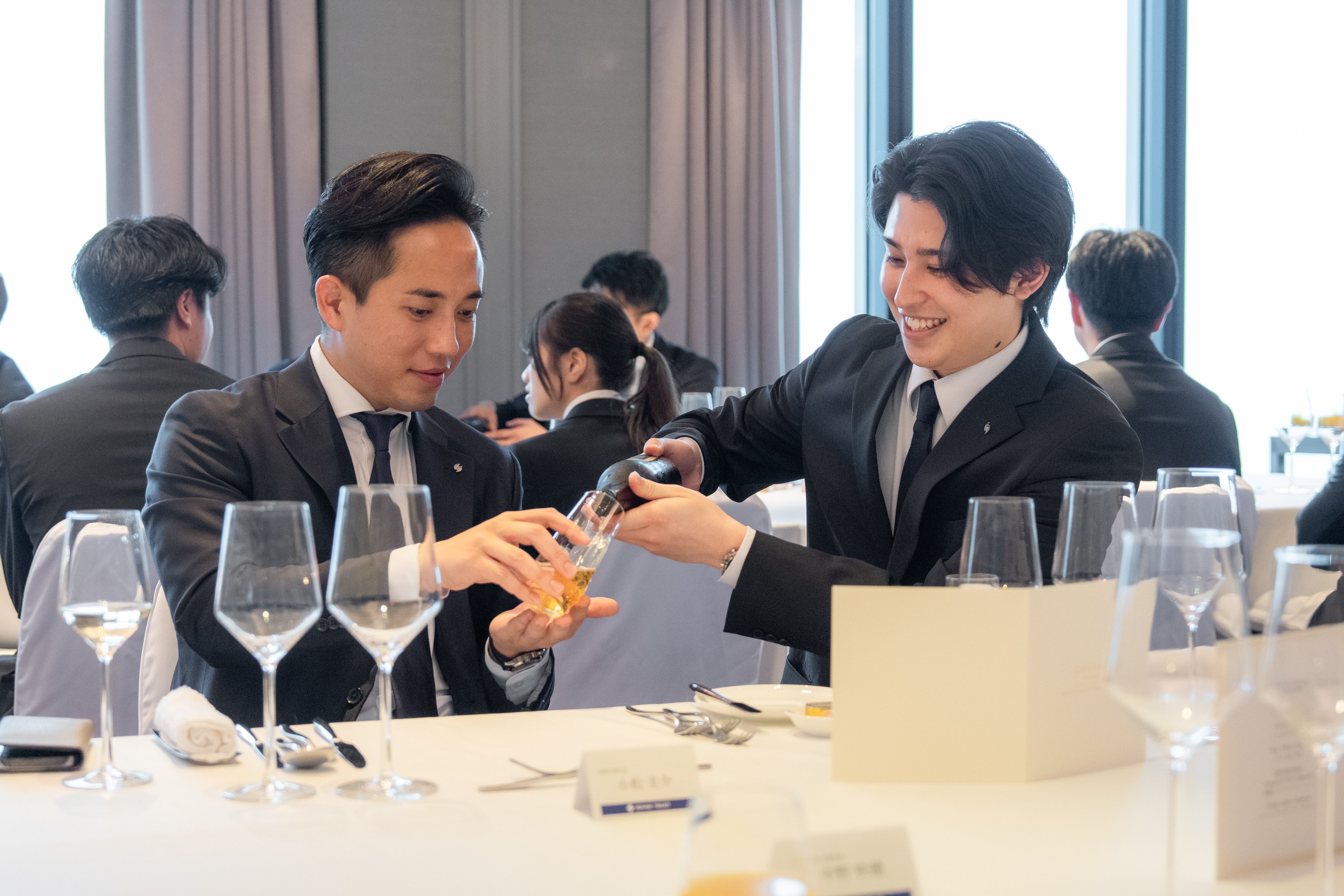 食事を楽しみながら、式典時とは打って変わって、緊張のほどけた雰囲気の中で、新入社員と役員陣が直接言葉を交わす時間になりました。