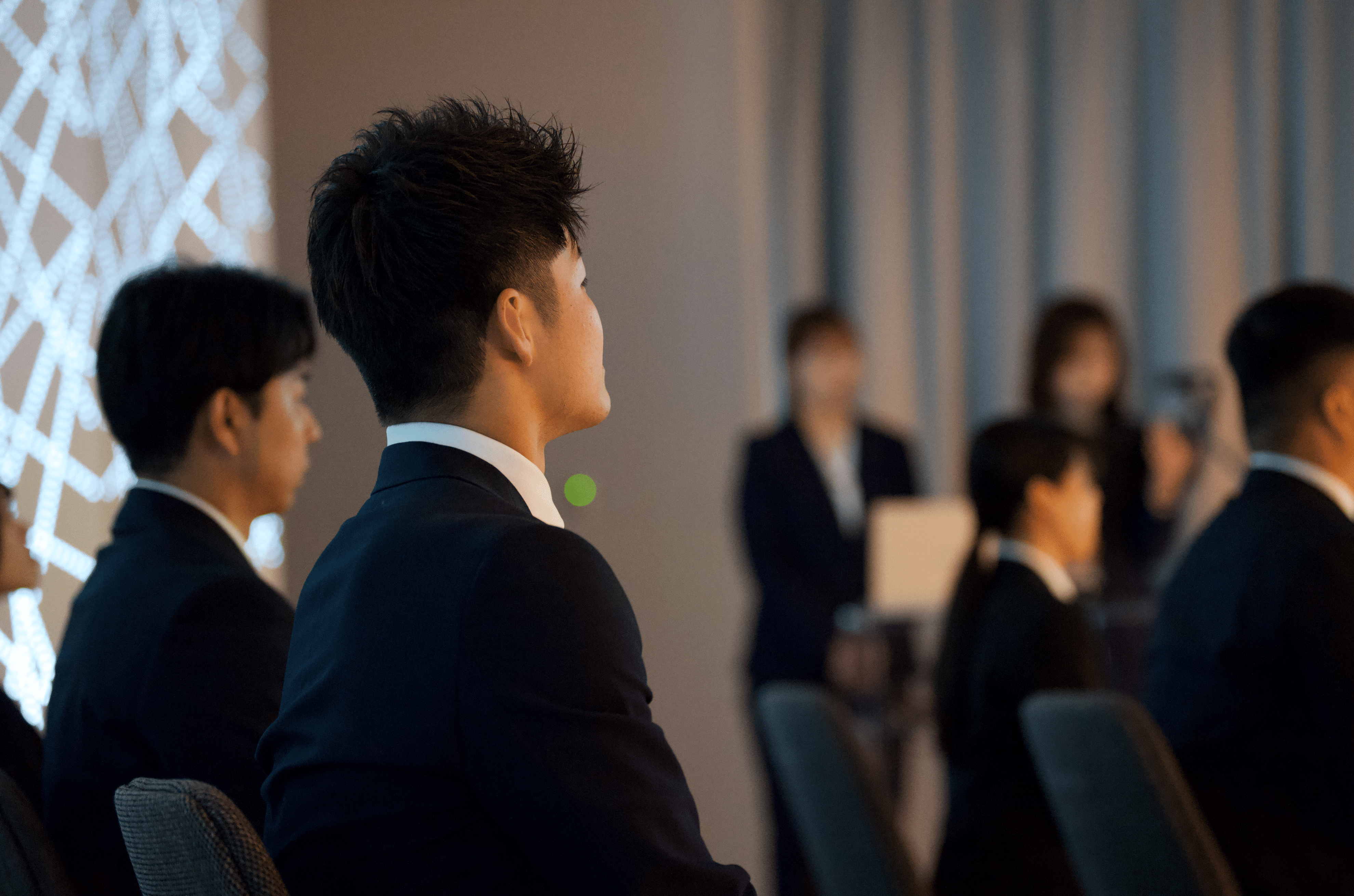 食い入るように映像を見つめる新入社員たちの姿が印象的でした。